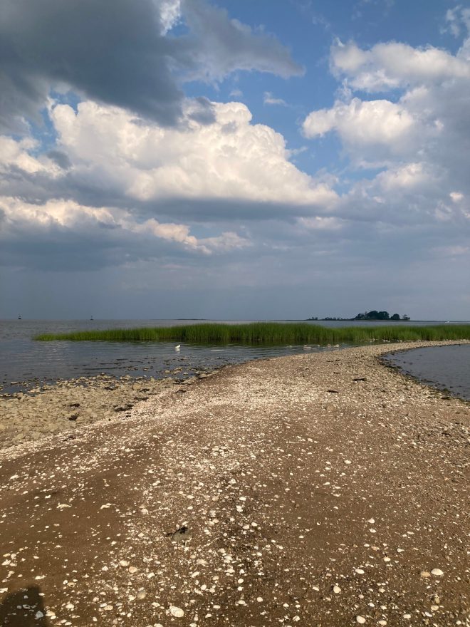 A string of small waves is rolling in caused by the speeding motorboats heading home. Perhaps these boaters are hungry for dinner after a day spent on the water. This is what I imagine. Otherwise, the water is calm and I think about kayaking. It’s tempting. My kayak is on the nearby rack and my paddle and life jacket are in the car. I love being on the water although I’m a lazy paddler. I don’t go far. Mostly just to that sandbar not currently visible. It should emerge in another few hours, a small stretch of sand where the oystercatchers hang out. I like to sit and swim there.